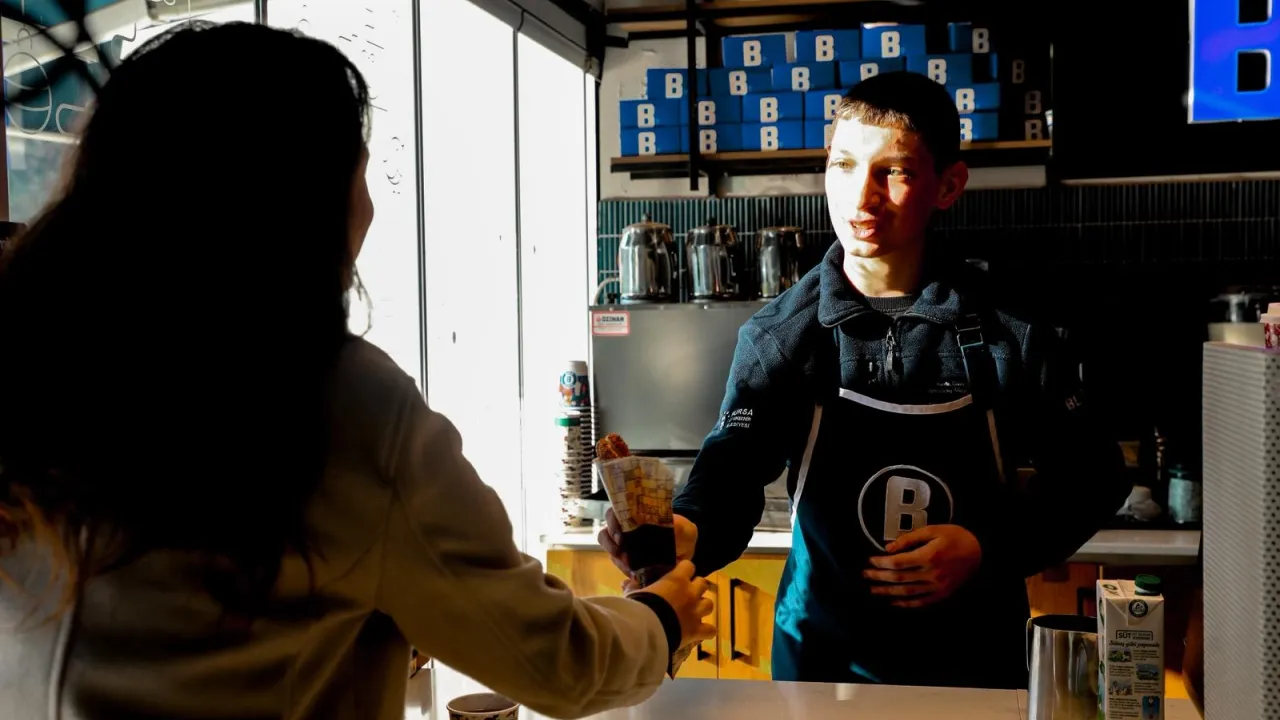 Merinos Parkı'ndaki BURFAŞ B Kafe'de stajyer barista olarak görev yapan 16 yaşındaki Ümit Hazar, barista önlüğünü giyerek personelle birlikte siparişleri titizlikle hazırlıyor. B Kafe'de staj yapmaktan mutluluk duyduğunu söyleyen Hazar, kafeye gelen vatandaşlardan da büyük takdir topluyor.