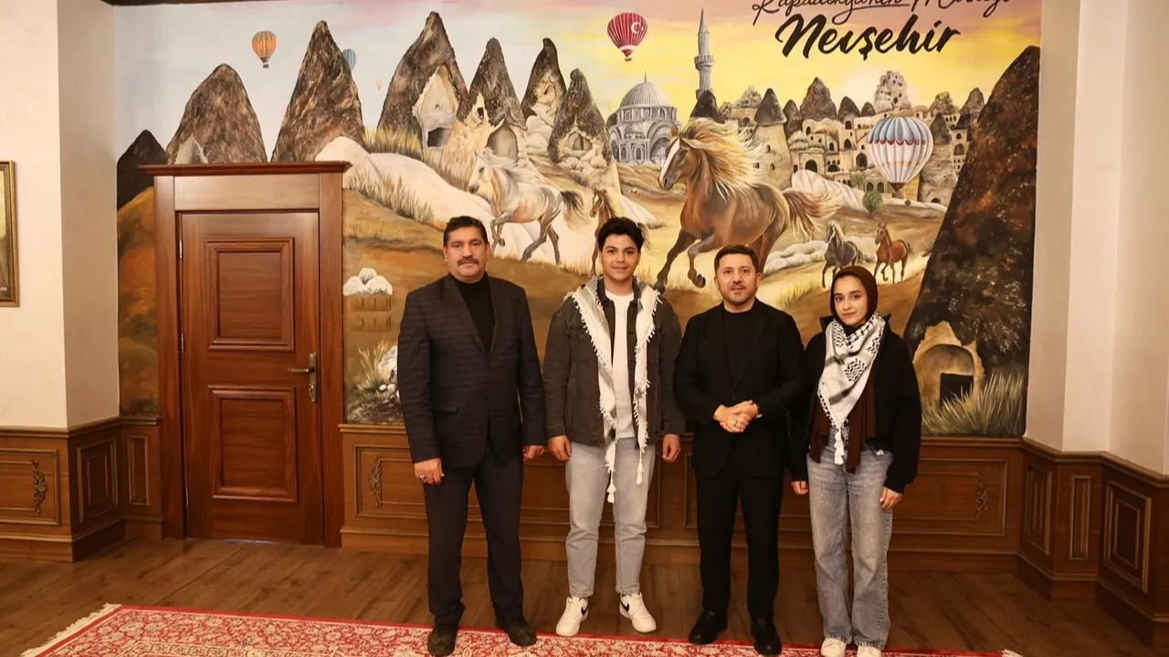 Nevşehir Hacı Bektaş Veli Üniversitesi'nde öğrenim gören 2 üniversite öğrencisi Filistin'e verdiği destek konuşmasından dolayı Nevşehir Belediye Başkanı Rasim Arı'yı makamında ziyaret ederek teşekkür etti.