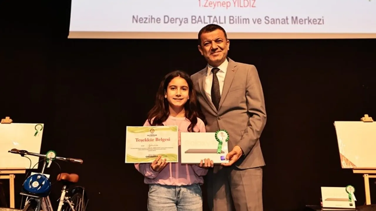 Denizli Büyükşehir Belediyesi tarafından çevre bilincini artırmak ve öğrencileri sanata teşvik etmek amacıyla düzenlenen Ortaokullar Arası “Sıfır Atık Sonsuz Sanat” temalı resim yarışmasında dereceye giren öğrencilerin ödüllerini Başkan Çavuşoğlu verdi.DENİZLİ (İGFA) - 5-6. sınıflar ile 7-8. sınıflar olmak üzere iki ayrı kategoride gerçekleştirilen yarışmada, jüri değerlendirmesi sonucunda her kategori için ilk 5 eser belirlendi. Nihat Zeybekci Kongre ve Kültür Merkezi'nde düzenlenen ödül törenine Denizli Büyükşehir Belediye Başkanı Bülent Nuri Çavuşoğlu, Genel Sekreter Yardımcıları Özgür Başkurt, Hülya Bartal, daire başkanları, çok sayıda davetli ve öğrenci katıldı. Programın açılış konuşmasını yapan İklim Değişikliği ve Sıfır Atık Dairesi Başkanı Umut Somyürek, Büyükşehir Belediyesinin sıfır atık konusunda gerçekleştirdiği çalışmalar hakkında kısa bir sunum gerçekleştirdi.